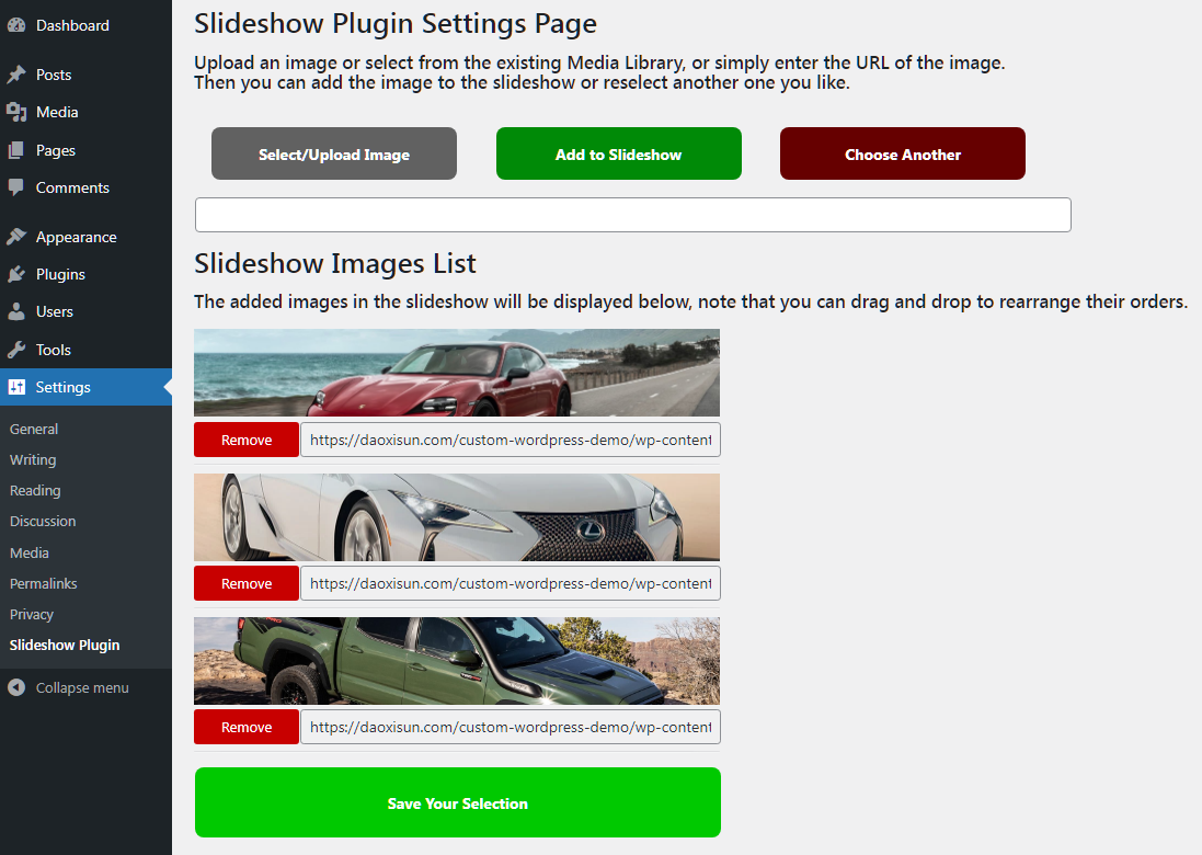 A submenu page is available under Settings for the admin to either upload an image or select an existing image, alternatively online images can also be added by simply copying the URL into the field. Once the Add button is clicked, the image will be added to the slideshow list, then the admin can drag-and-drop each item to rearrange their orders of display in the slideshow. These settings will be saved to the database once the save button is clicked.