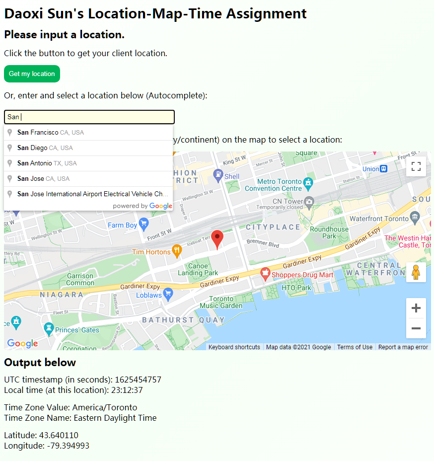 A quick simple web assignment for Accuenergy (Canada) Inc, it utilises Google Maps JavaScript API, Google Places API (for Autocomplete), and Google Time Zone API.